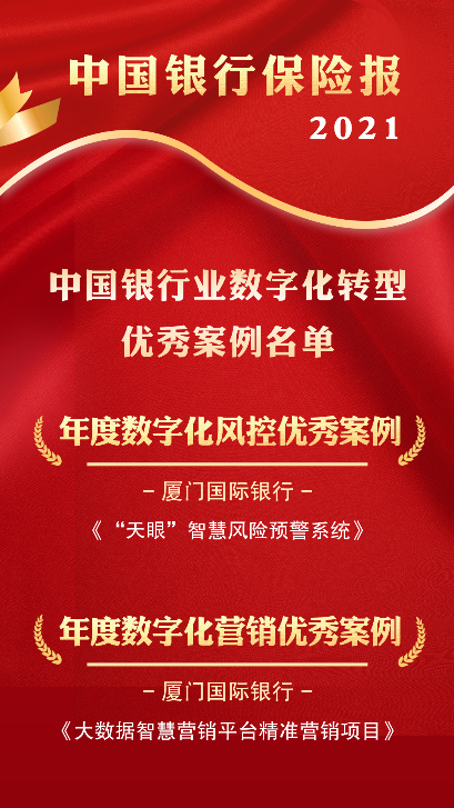 近日,在“2021中国银行业数字化转型案例征集”活动中,厦门国际银行报送的“‘天眼’智慧风险预警系统”和“大数据智慧营销平台精准营销项目”,分别获得“年度数字化风控优秀案例”及“年度数字化营销优秀案例”奖项。
