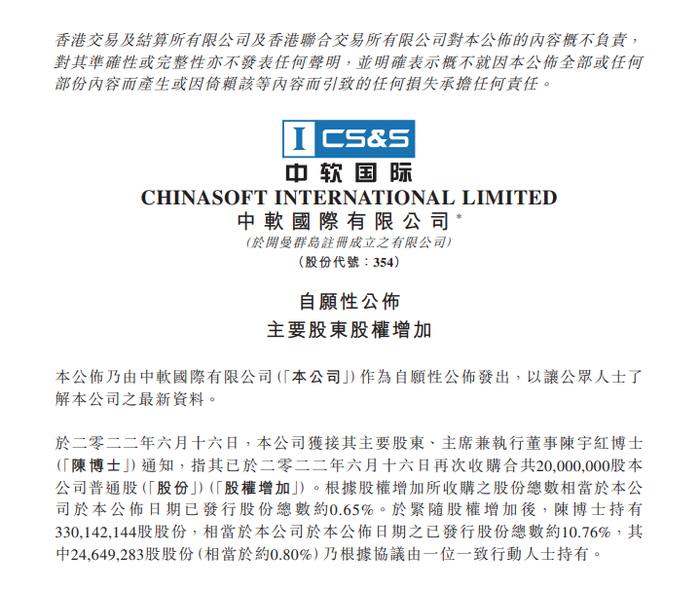 根据港交所权益披露资料以及公告显示,6月16日,中软国际有限公司(00354)(简称“中软国际”、“公司”)董事局主席陈宇红博士大举增持2000万股中软国际股份,管理层大手笔增持背后释放出的积极信号,值得投资者关注。