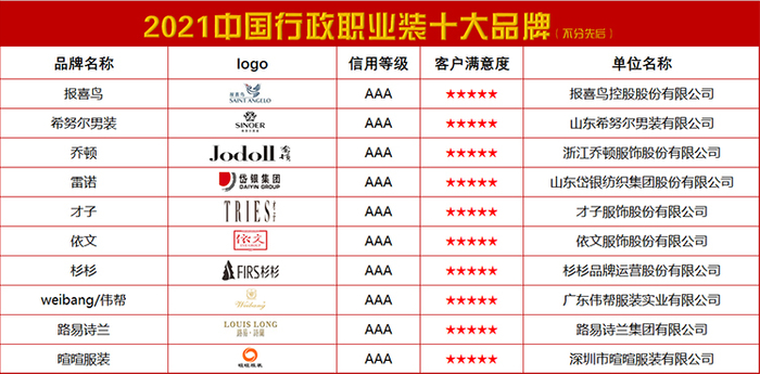 招投标供应链品牌推介平台作为全国招投标领域领先的品牌推介服务平台,一直致力于促进供应商加强品牌建设,倡导品牌采购消费,扩大品牌在采购市场和消费市场的知名度、美誉度及影响力。于近期举办了以“绿色创新——定义品牌新生态”为主题的“2021中国服装招标采购评价推介”活动,从众多职业装知名品牌中甄选出具有高品质、诚信、研发设计能力与服务能力较强,综合实力突出的“行政职业装十大品牌”供应商,加以大力宣传推介,树立品牌标杆,展示品牌良好形象,发挥品牌引领带动作用,为广大需求采购单位和社会各界提供参考。具体如下: