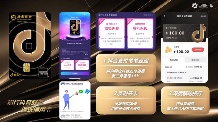 6月16日巨量引擎联合招商银行,推出首张抖音联名返现信用卡,包含更丰富的信用卡权益模式,实现在抖音消费即有返现,并与多个生活消费场景有机结合。