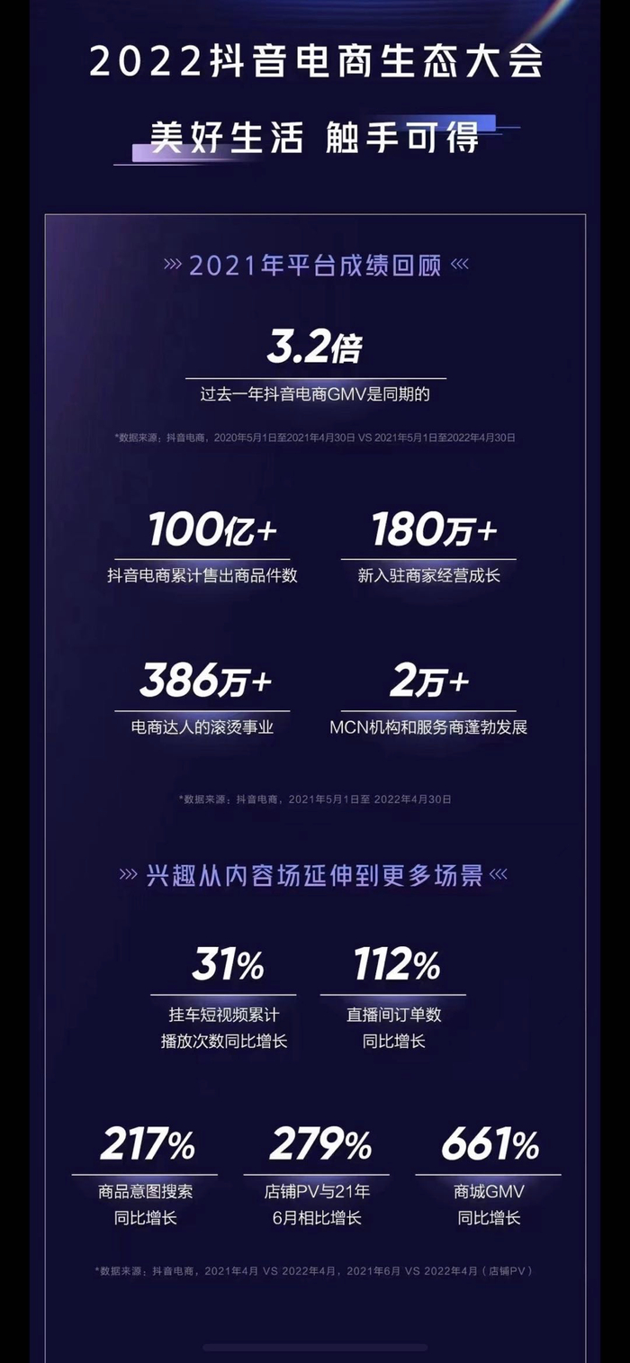 以抖音电商为例,过去一年,抖音电商GMV是同期的3.2倍,售出超100亿件商品,其增速证实了抖音电商模式不仅满足用户潜在购物兴趣,更通过优质内容将商品和消费者连接起来。