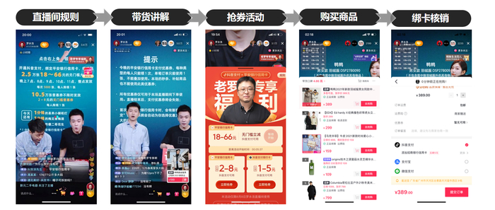 在“动卡”上,联名卡与运营玩法深度结合。 在平台的推动下,许多直播间在带货讲解的同时,插入抢券活动广告、或者是提示用户,在购买指定商品时,利用抖音联名卡支付即可享受优惠。在主播的引导下,消费者对于联名卡对具体某一款商品带来的实效优惠有充分感知,绑卡核销的认知通过具体消费动作建立起来。