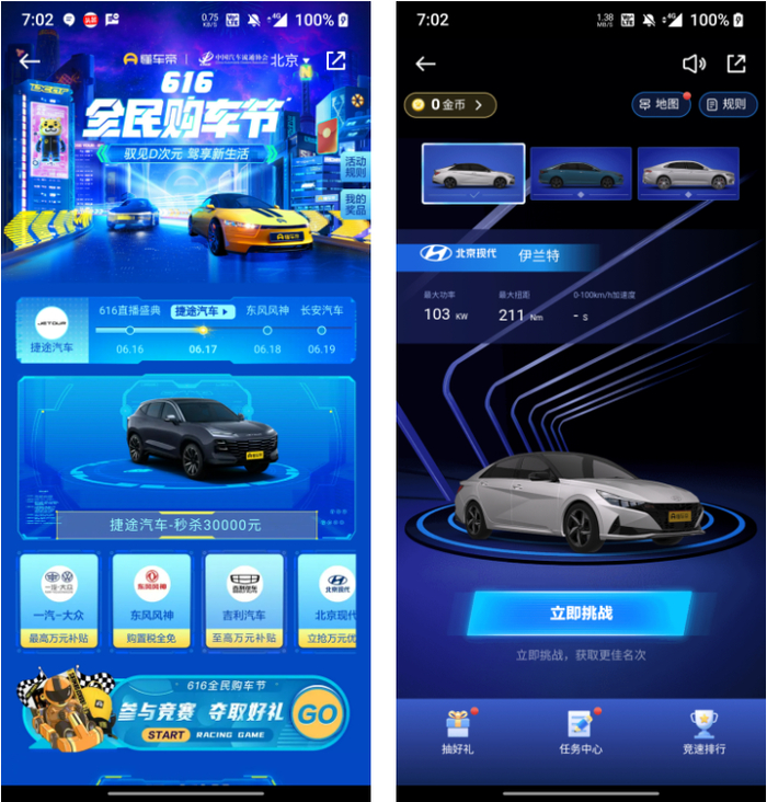 其次是产品全效跟进,616全民购车节期间,懂车帝在产品层面率先上线了品牌专属线上XR展厅和定制竞速赛车游戏,用交互产品的全新升级,实现品牌印象与关注度的最大化。