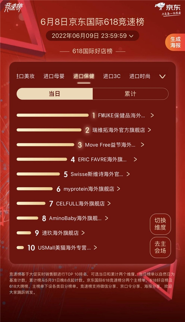 京东竞速榜进口保健品类目,FMUKE力压一众国外品牌,在6.09当日获销量榜首,其主打产品FMUKE NMN18000成为FMUKE保健品海外旗舰店当日成交额最高的单品之一。