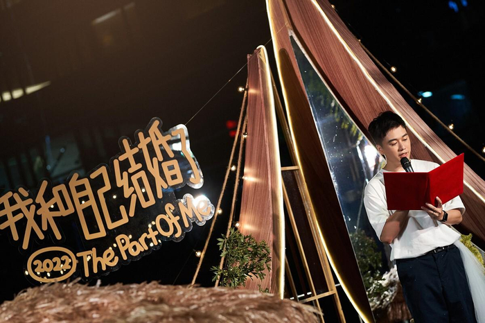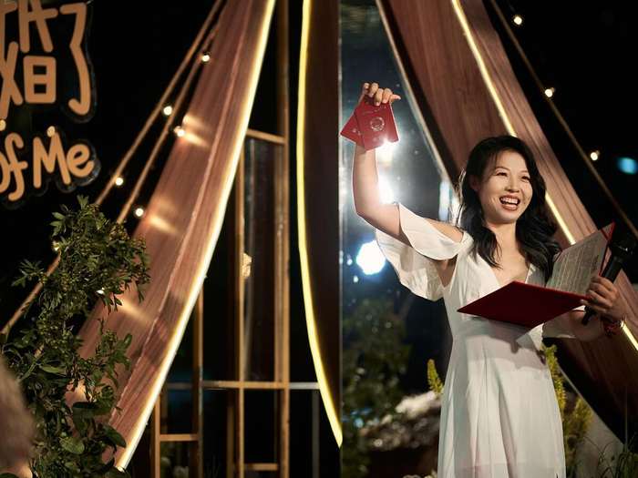 在婚礼过程中,10 位勇敢的新人走上舞台,和大家分享自己的故事和心情。经历过两段婚姻的 Amy,决定和自己进行 “第三婚”,她展示出自己的两本离婚证,笃定地告诉大家:每一段婚姻都帮助她进化成了更完整的人。现在的她,已经不需要另一半的拥抱,就能好好照顾自己了。