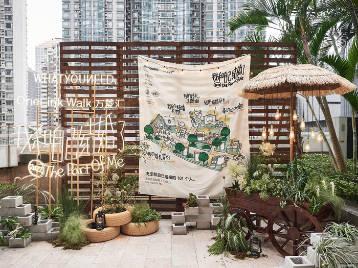 2022年6 月 18 日晚,在广州万菱汇四楼天台花园,101 位新人同时入场,签署和自己的婚礼誓词,分享自己理想的婚礼主题曲,拍下和自己的结婚证件照,交换了送给彼此的结婚礼物 —— 不用昂贵的钻戒和隆重的仪式,这样触手可及的形式,就可以完成对自己的承诺。
