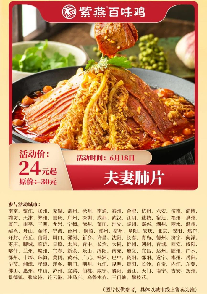 作为招牌产品,紫燕百味鸡夫妻肺片还推出了限时优惠。 2022年6月18日当天,在口碑APP搜索紫燕百味鸡,原价30元/份的夫妻肺片,父亲节活动价24元/份起。这一次,也让父亲体验一下被你关心、宠爱的感觉,带着老父亲最爱的下酒菜,诉说着只有你们知道的“小秘密”。