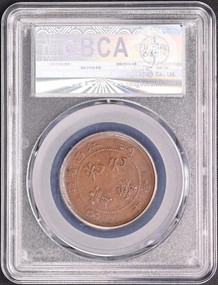 这种铜币存世量较少,历来被认为是江西铜元中的精品,特别是大字江西飞龙更为珍稀。小字江西飞龙也深受玩家们喜爱,正面中心小横式六瓣花,周边楷书光绪元宝四汉字,珠圈外上缘小字江西省造,背面江西飞龙,无珠圈,龙角较长,上有英文江西字母,下有英文当十。目前公博评级有些许此类封装币,可谓江西大小飞龙铜元中的佼佼者。
