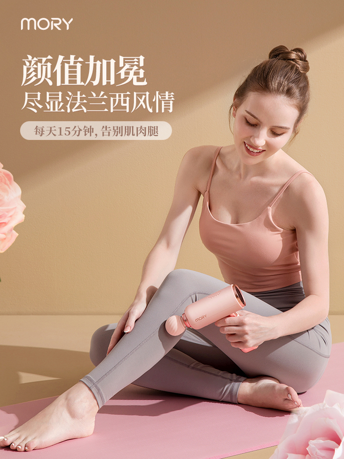 以摩韵最新推出的“炫飞轮”筋膜枪为例,该款筋膜枪不仅在按摩性能上达到了专业级别,而且只有手掌大小,轻巧便携,让女性用户可以一手掌控,更采用前倾30°的天鹅颈弧线设计,让女性在使用时可以利用筋膜枪自然前倾的重心,不必用力紧握手柄即可以达到深层放松肌肉的效果。