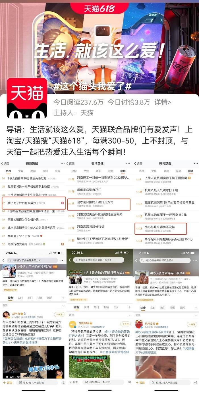 在#有爱才会合拍#的主话题下,天猫“蹭”上了王心凌爱你、毕业季云合拍、圣火喵喵教等微博热点,打造了#比心总是来得猝不及防#、#这才是合拍的正确打开方式#、#被人类通用手势拿捏了#等热点话题,并延续话题热度,推出#这个猫头我爱了#进行品牌矩阵联合发声。