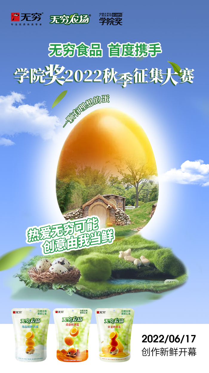 新经济迎来新时代,新文化开创新篇章,新消费对话新青年。Z世代作为新消费力量,是当下消费市场最具生机、最富多元性的代名词,展现着中国经济的市场广阔和前景光明。抓住Z世代,就是掌握了未来市场的话语权。无穷食品拥抱年轻,奔赴未来。2022年无穷食品牵手国家级赛事——学院奖2022秋季征集大赛,携“一颗有理想的蛋”无穷农场鹌鹑蛋首次登录“创意星球”,向全国高校百万青年发出品牌共创邀约!