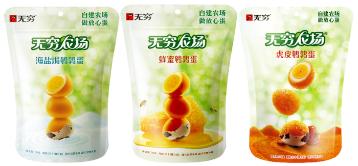 在“抓源头、保源头、安全为先”理念下,无穷食品为了一颗好蛋,在原始森林环绕的凤凰山脚下自建了无抗绿色有机无穷农场,精选优质鹌鹑,原生态绿色养殖自然生长。无穷农场的每颗鹌鹑蛋精选美国农业部认证的哈夫值72以上AA级蛋,仅45分钟农场直达工厂,每颗都是0农残放心蛋,确保极致新鲜。其自主研发首创的航天级抽真空压强、高温瞬时杀菌、厌氧充氮、高阻性铝膜四重物理锁鲜技术,让产品新鲜看得到。