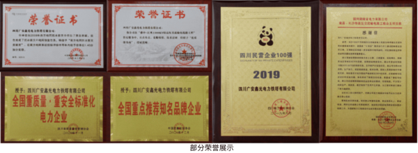 公司为“AAA”级信用单位,先后获得“南方电网抗冰救灾贡献奖”、 “四川省名牌产品”、 “省级守合同重信用企业”、“2019四川民营企业100强”、 “全国重质量重安全标准化电力企业”、“全国重点推荐知名品牌企业”等荣誉。