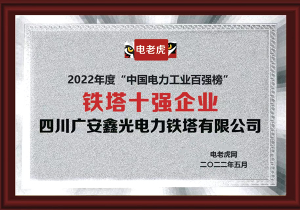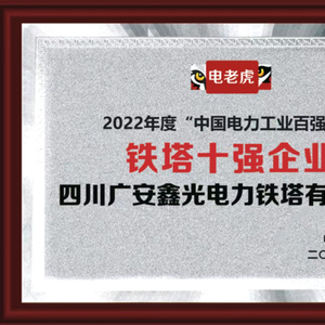 四川广安鑫光电力铁塔有限公司凭借超强的综合实力、优秀的品牌口碑、超高的人气支持等荣获2022年度“铁塔十强企业” 荣誉称号。