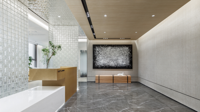 前厅悬挂的艺术创作,由多位科图建筑师亲手绘制而成。以纯粹沉稳的黑色为画面基底,中性、中立的白色线条自成态度的发散、重组与聚合,线条与线条之间建立起紧密的几何联系,让画面看似自由零散,实则有序,给人留下充满探索感和神秘感的独特印象。犹如建筑师工作过程中,面临着千头万绪的不确定性与复杂多变的可能性,我们需要不断探索与发现找出最适合项目的解析方式。