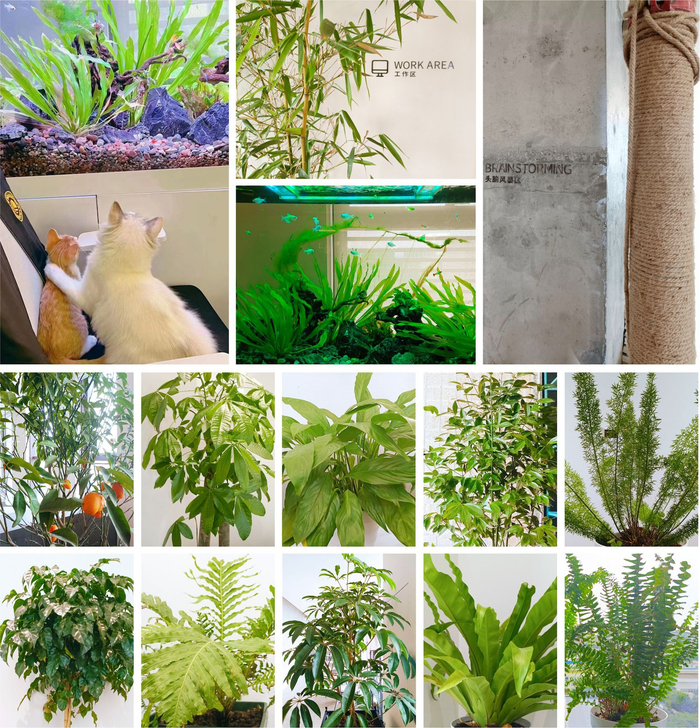 不管是空间的营造,还是萌宠的喂养,以及绿植的选育,一切都是设计师们精心的安排。希望绿色的空间能帮助小伙伴们快速进入属于自己的办公状态,而当劳累时,可以起身浇花,除草、逗猫、喂鱼……不管繁杂的工作如何变化,绿色空间都能恰如其分地让思绪轻松流淌,帮助团队有机地不断向上成长。