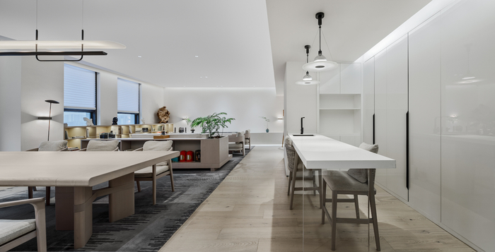 黑白灰与木质的比例和光线在矩形体块上形成的韵律感,让空间充满着吸引力。依据功能区域划分而形成的路线,是空间表达的明线;依据视觉引导的