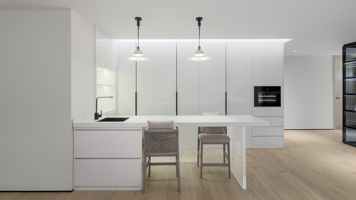 △ 前厅 / 前厅 / 光线游戏踏入电梯厅的那一刻,温润的木质盒子形成包裹,迎面粗糙的白色石材背景灵感来源自中式园林的照壁,暖色线性灯光引导形成归家之仪式感。电动门缓缓打开,简洁克制的几何空间映入眼帘,设计师以分割精确的比例线条,贯穿视觉元素,不同材料的碰撞形成戏剧般的效果。坚硬的、柔软的、透明的、温润的,在光的跳跃中慢慢融合。整面透明的水晶砖在光线的穿透下波光粼粼,犹如晴天荡漾的湖面,时光静好。