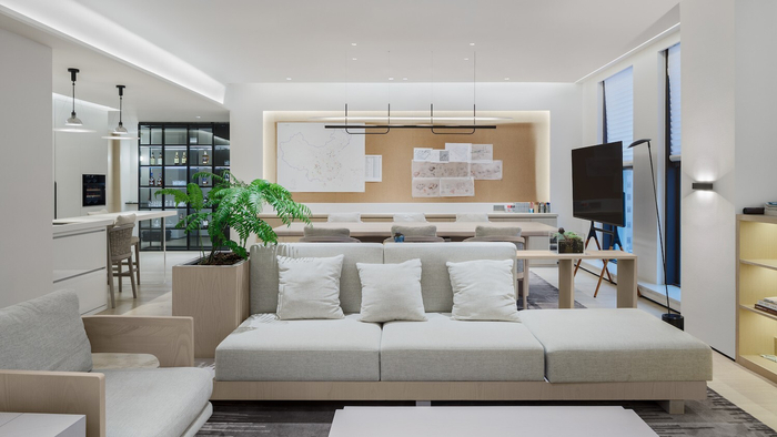 方正的空间限制了想象,但也被设计师赋予新灵感。设计以“ 游走 ”的空间形式串联,承序游园之感,让光线和植物在空间中渗透。整个公共办公区形成一种流动的空间格局,给人以“ 无边界 ”回归本质的空间体验。