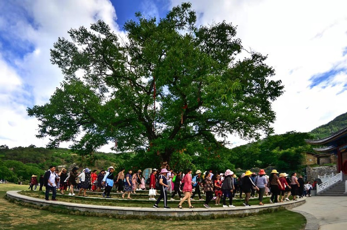 在三千年前的苍山崖画中有一幅采摘图,形象再现了漾濞江流域土著先民攀高摇竿敲打果实和树下众人拾捡果实的场景。专家推测,当时这里就有核桃树生长,采摘图反映的即是打核桃的场景。春去秋来,夏归冬至,白云依旧守候着核桃树林,树林始终庇佑着树下的村庄。如今,一棵棵高大古老的核桃树分布在房前屋后,每棵树上都挂着“身份证”。村子中央的空地,可见一棵异常高大粗壮的核桃树,这棵“核桃神树”是整个村里树龄最大的,已经有1165岁了。