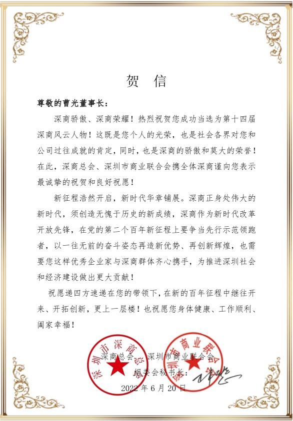6月14日,由深商总会、深圳市商业联合会、深圳广播电影电视集团、深圳报业集团联合主办的第十四届“深商风云人物”评选榜单揭晓,递四方董事长兼总裁曹光获评“深商风云人物”。