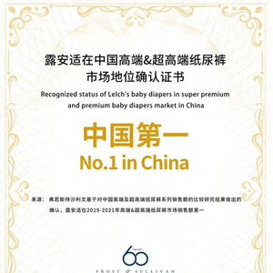 基于对2019年至2021年中国婴儿纸尿裤市场的调研和分析,以及对业内相关公司的研究和评估,全球著名增长咨询公司弗若斯特沙利文(Frost & Sullivan,以下简称“沙利文”)授予露安适“2019-2021年中国高端及超高端纸尿裤市场地位中国第一”认证,这象征着对露安适在中国婴幼儿纸尿裤市场杰出表现和优秀成绩的认可。