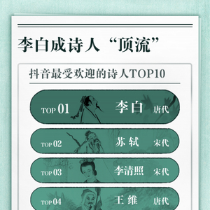 报告显示,“诗仙”李白是抖音网友最喜欢的诗人代表,苏轼、李清照紧随其后,王维、白居易、杜甫、辛弃疾、屈原、陆游、李商隐等历代诗词大家也在榜单之列。在最受欢迎的唐诗一项中,王维的《相思》力压李白的《将进酒》,位列榜首。