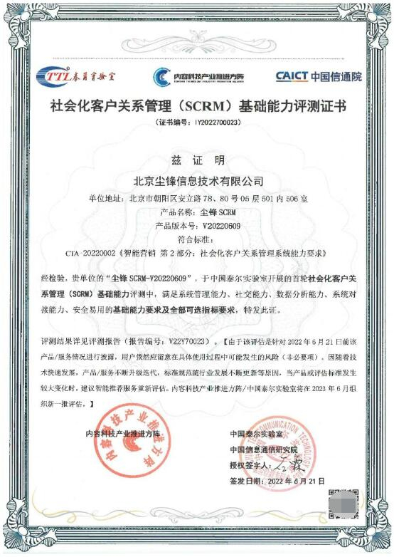 据了解,本次评测依据《智能营销系列标准》进行,共涉及5个能力域,38项能力点,评估SCRM的基础管理能力、社交能力、数据分析能力、系统对接能力和安全易用性。经过中国信通院泰尔实验室专业、严苛的评测,尘锋SCRM顺利完成全部测评项目,成为国内首个获此认证的SCRM系统。