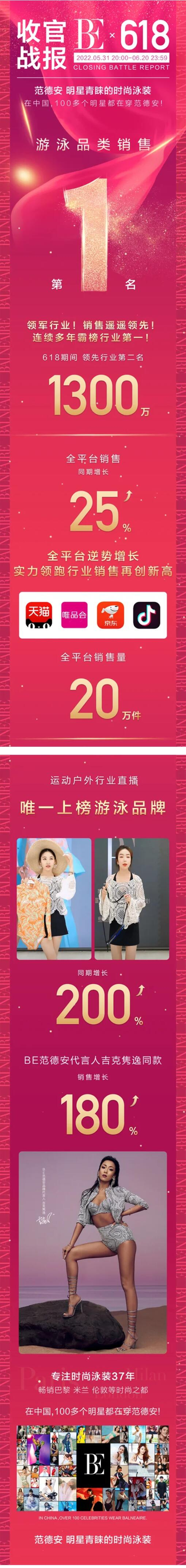 在刚刚落幕的618活动中,BE范德安销售额再创新高,以傲人战绩稳坐“游泳品类销售”第1名。在618期间,BE范德安销量遥遥领先,全平台销量达20万件,销售额全面领先行业第二名1300万,同期逆势增长25%。不仅如此,BE范德安还成为“运动户外行业直播”唯一上榜游泳品牌,同期增长200%;代言人吉克隽逸同款销量暴涨180%……小编了解后得知,原来BE范德安早就登上了法国国际时装周,成为了亚洲唯一亮相女性贴身用品品牌,随便在网络上搜索,竟然100多个明星青睐的时尚泳装品牌。
