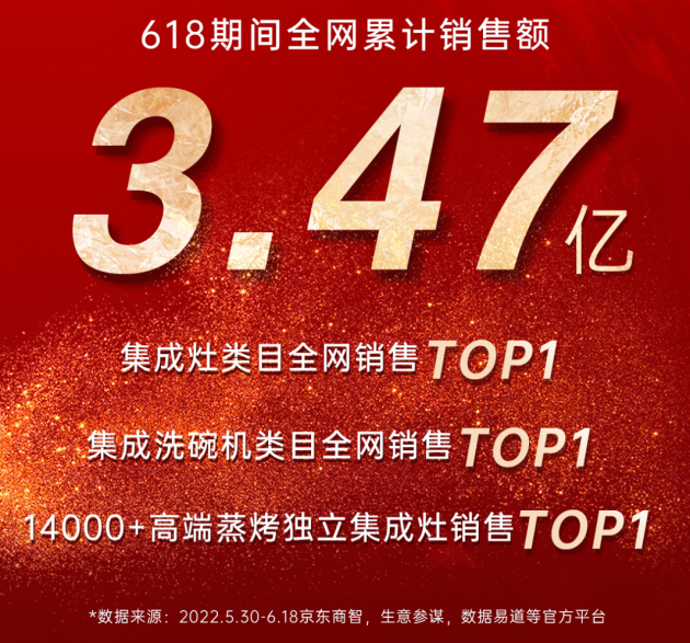 来自官媒的权威认可,助力火星人集成灶在618大战中全网累计销售额高达3.47亿,不但再次刷新自己创造的行业记录,更较去年618同比增长29.48%,同时斩获集成灶类目销售、集成洗碗机类目销量全网双冠王的惊艳战绩。