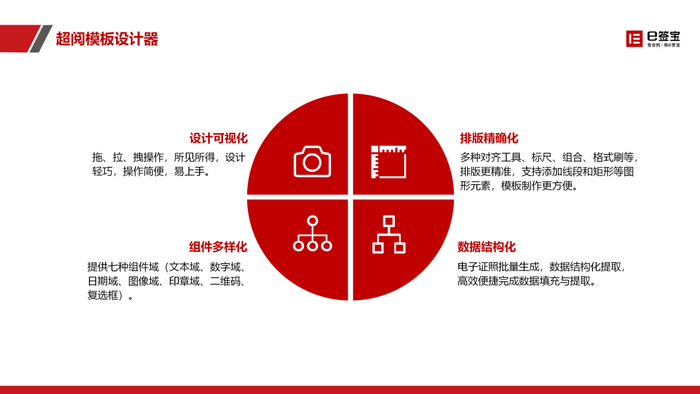 全新升级的超阅模板设计器,不仅设计组件更加细分为文本域、数字域、日期域、图像域、印章域、二维码、复选框七个类域,而且设计操作更加轻巧,通过不同组件的拖、拉、拽等操作,即可实现所见所得的快捷设计。多种对齐工具、标尺、组合、格式刷等工具,让排版更加精确,使用也非常简便,易于上手。