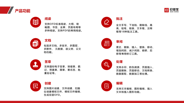 e签宝“超阅”版式办公套件基于符合中国电子公文标准的OFD格式打造,为OFD版式文档的生成、编辑、存储、签章、共享等提供一体化技术支撑,保证电子文档的真实性、完整性、可靠性和安全性助力党政机关有效打通电子公文形成、办理、归档、保存全流程电子化的“最后一公里”。