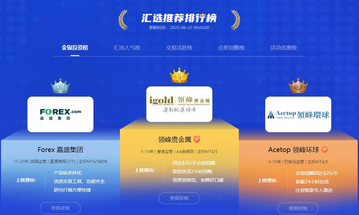 国际黄金投资发展至今,市场及服务都日臻完善,我们要如何快速找到口碑、实力靠前的安全平台?炒黄金正规平台有哪些?接下来,汇选网(www.xuaneasy.net)就为大家具体盘点2022年十大最新的金银投资正规平台口碑榜,供广大投资者参考。激烈竞争中,一批像领峰贵金属、嘉盛集团、领峰环球、浦汇等炒黄金口碑平台,表现较为出众。