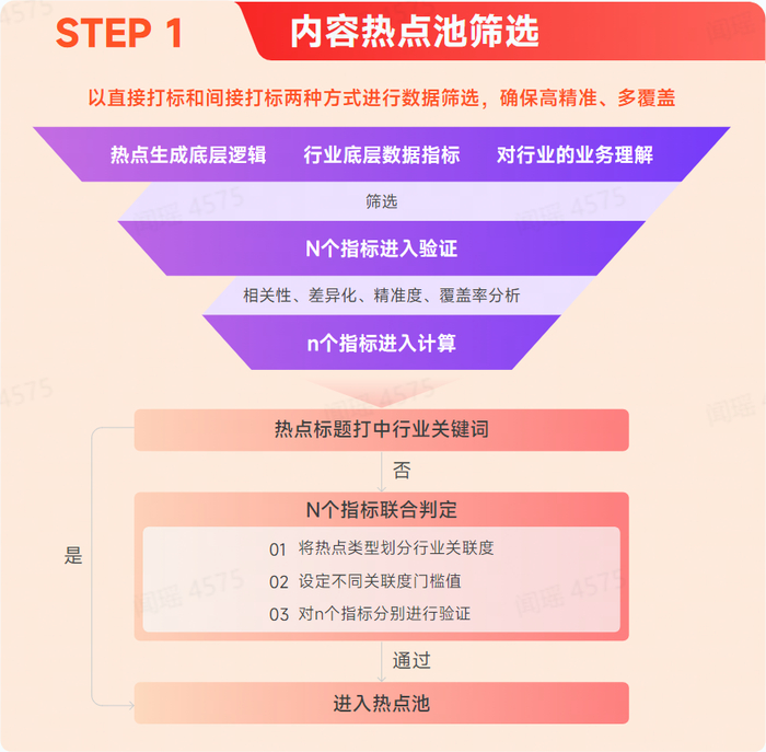 第一步,内容热点池筛选。通过行业底层数据指标以及对行业的业务理解,以若干指标进行验证与计算,最终判定一个热点话题是否能进入热点池。