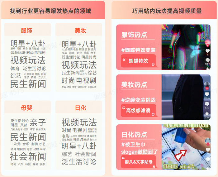 举个例子,抖音上不同行业热点的视频类型不同,找到行业更容易爆发热点的领进行创作,更容易抓住消费者注意力。服饰行业容易爆发热点的视频类型是明星+八卦、民生新闻,母婴行业则是亲子、社会新闻,同时结合站内玩法如特效、滤镜等等,效果更好。