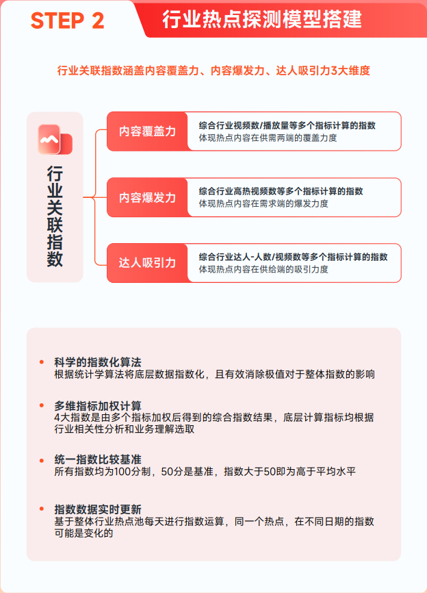 第二步,有了热点池,再搭建行业热点探测模型,将底层数据进行科学指数化算法加工,同时加权计算多维数据,最终呈现出4个核心指数: