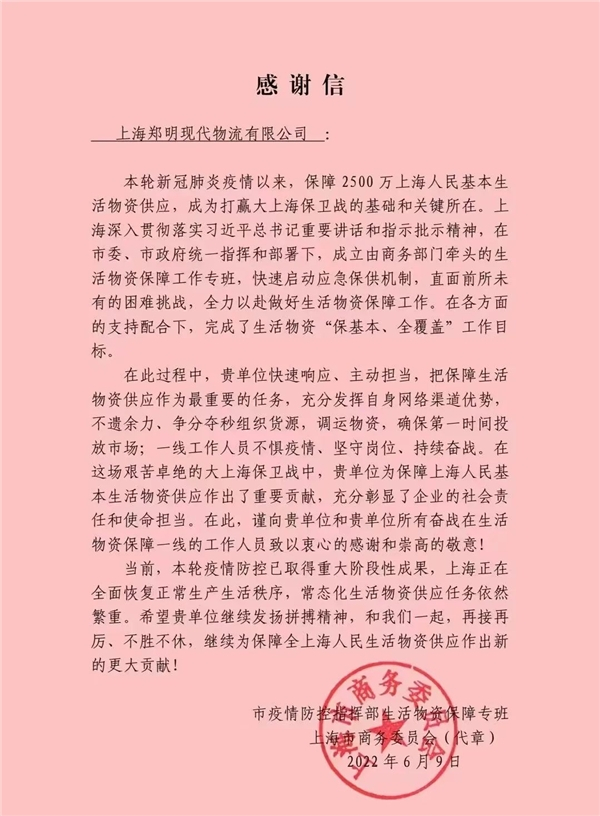 一封来自上海市商务委员会的《感谢信》 ——郑明物流守“沪”工作获肯定