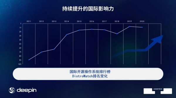 从国内外影响力上看,deepin在全球开源操作系统排行榜上位居前列,也是排名最高的来自中国的社区发行版。同时,deepin2019年、2020年、2021年连续三年荣获最受欢迎中国开源软件第一名,在国内外影响力持续提升。