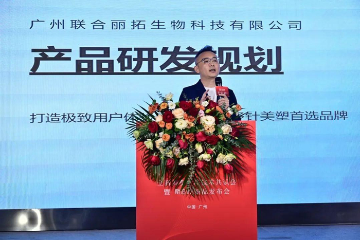 主办方致辞环节,广州联合丽拓生物科技有限公司总经理黄淋斌先生上台为大会致辞。“我们要做医美界的小米”,黄总为大家首次阐述了联合丽拓的企业愿景,他表示“联合丽拓在未来的发展中,将以此为目标持续进取,坚定推出极具性价比、感动人心的好产品,将更多利润回归客户,让更多求美者享受医美发展带来的蜕变”。