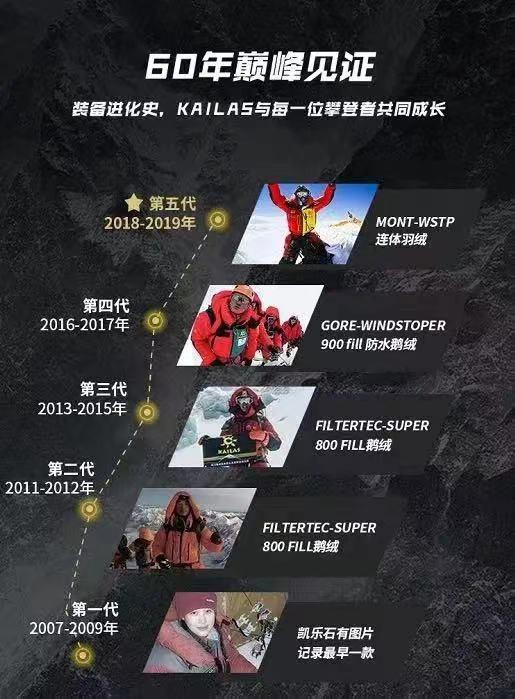 在此次珠峰之行中,凯乐石8000+高性能珠峰连体羽绒服功不可没,目前这件WSTP 连体羽绒服已成为8000米雪线以上占有率最高的技术着装,它满足了在高海拔攀登这样的极端环境下对装备的三大诉求:御寒、防风、轻量。自2007年诞生以来,MONT 8000+连体羽绒已升级至第五代,不断在技术和工艺上突破创新,只为给每一个有攀登梦想的人更好的体验。
