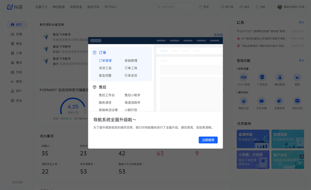 当前新版抖店后台已经全量,即日起您的账号登录后台后,就能够直接看到新版的操作界面,以上功能都能即刻体验!