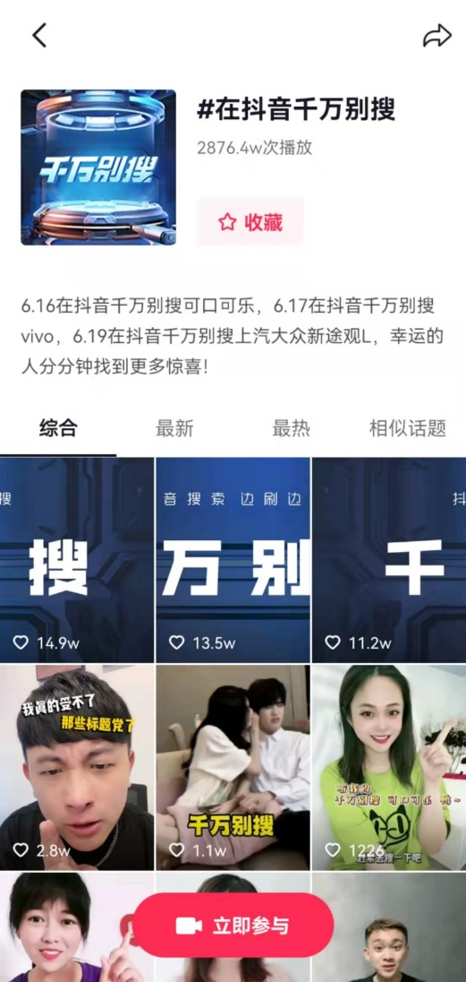 “边刷边搜”已经成为抖音用户新常态,近期,巨量引擎联合可口可乐、vivo、上汽大众新途观L,以抖音搜索广告为核心基点,围绕“千万别搜”主题开展的创新营销掀起出圈热潮,为短视频内容生态下的搜索营销打开了新的想象空间。