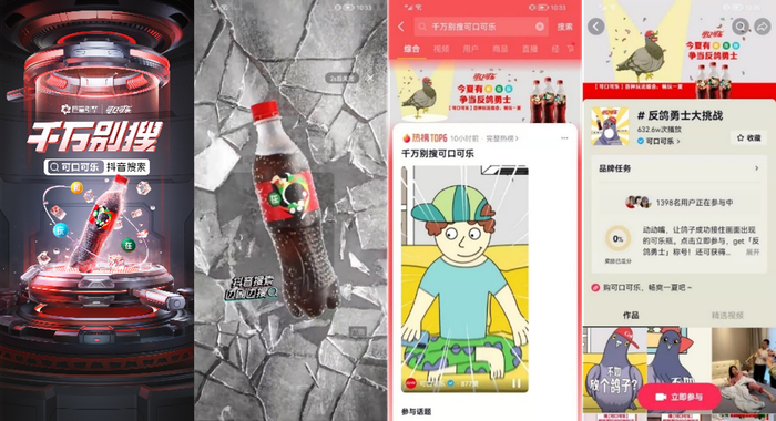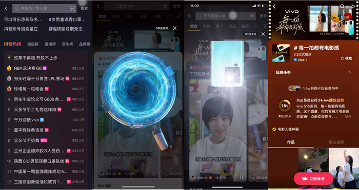 路径二,利用抖音热榜,实现高强度引流。 在抖音热榜设置#千万别搜可口可乐、#千万别搜vivo等话题,引发用户好奇点击,而用户的点击行为又会进一步推动爆款话题升温。进入热点品专和品牌全民任务挑战赛后,丰富的玩法和内容不仅承接了用户的热榜兴趣,更打造了品牌的超强声量。