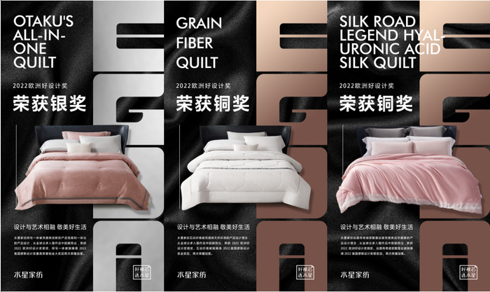 “阿宅一体被”采用被胎被套一体式设计,整被水洗不移位,经久耐用不变形,极大地满足了现代人对便捷生活的需求,继摘得“2022 美国缪斯设计奖最高荣誉铂金大奖”后再次荣耀加冕,斩获“2022欧洲好设计奖——银奖”;“五谷纤维被”采用取自花生、大豆、大米、小麦、玉米等自然植物的谷物蛋白,经过科学比例复配后制成的五谷蛋白科技纤维填充,天然环保,健康无刺激,继摘得“2022 美国缪斯设计奖金奖”后,再次斩获“2022欧洲好设计奖——铜奖”;“丝路传奇玻尿酸蚕丝被”颇具巧思,将常用于护肤品的玻尿酸成分植入蚕丝被面料中,赋予织物更柔顺丝滑的触感,继摘得“2022 美国缪斯设计奖银奖”后,再次斩获“2022欧洲好设计奖——铜奖”。