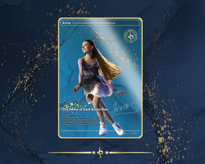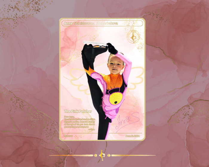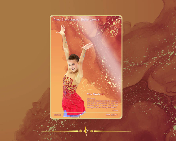 卡牌的正面,是少女明媚的笑容、舒展优美的身姿、向全世界展示金牌的喜悦,以时间顺序串联起谢尔巴科娃的花滑之路。卡牌以花滑旋转姿态翻转后,“千金”谢尔巴科娃以流利的英语娓娓道来卡面记录的美好时刻背后的故事。