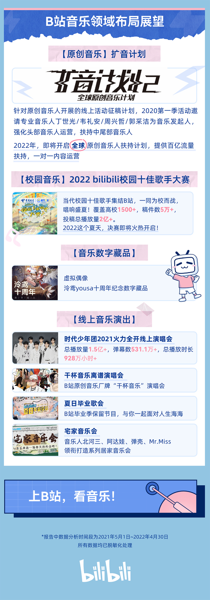 在疫情反复的当下,B站也更加关注线上音乐演出类活动,继去年火爆的时代少年团2021《火力全开》线上演唱会,以及B站原创音乐厂牌“干杯音乐”演唱会后,今年连续第三年举办《夏日毕业歌会》,用一场音乐之旅陪伴首批00后告别校园生活,开启人生新阶段。