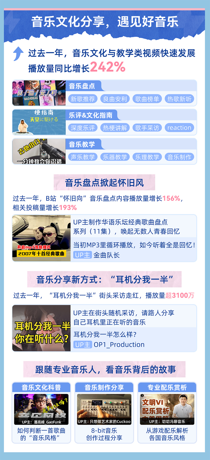 音乐盘点、乐评与文化指南、音乐教学类视频也是B站音乐区的特色内容之一,不少专业音乐人、音乐发烧友通过制作视频分享自己对于音乐的见解与热爱。过去一年,B站“怀旧向”音乐盘点内容播放量增长156%。此外,“耳机分我一半”街头采访走红,UP主请路人分享自己耳机里正在听的音乐,成为年轻人的音乐分享新方式。