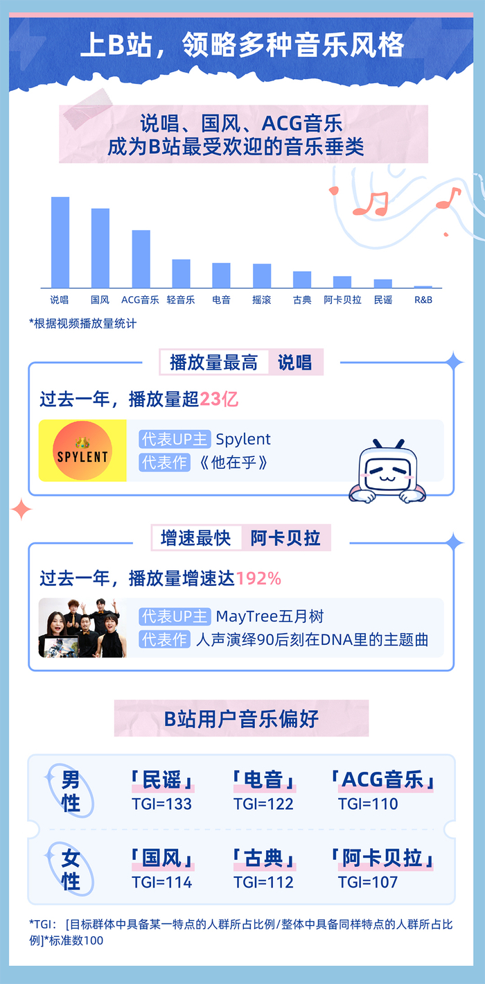 在B站众多音乐风格的视频中,说唱、国风、ACG音乐是最受欢迎的音乐垂类。其中,说唱播放量最高,过去一年说唱视频总播放量超23亿。阿卡贝拉(即无伴奏合唱)视频增速最快,过去一年播放量增长192%。用户音乐偏好上,男性偏爱民谣、电音、ACG音乐,女性则偏爱国风、古典、阿卡贝拉。