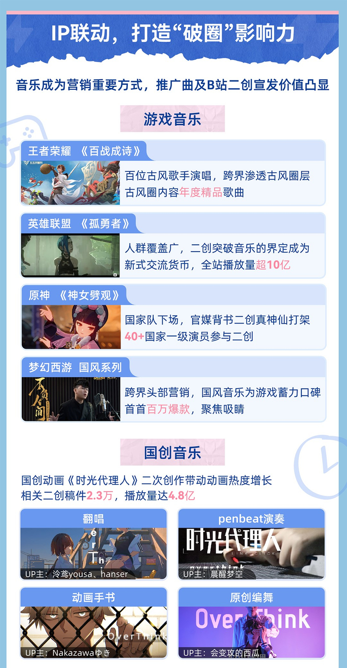 在B站,推广曲及二创在营销领域也显示出重要价值,无论是游戏、国创还是影视、品牌宣传领域,都涌现出不少爆款稿件。以游戏音乐为例,王者荣耀的《百战成诗》、英雄联盟的《孤勇者》、原神的《神女劈观》以及梦幻西游的国风系列音乐,都曾通过音乐MV及二创迅速扩大影响力。