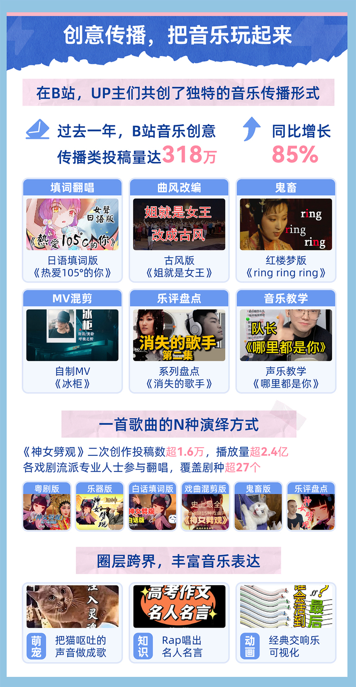 在B站,UP主们共创了填词翻唱、曲风改编、鬼畜、MV混剪等多种音乐传播形式,形成了独特的“玩音乐”氛围。过去一年,B站音乐创意传播类视频投稿量达318万,同比增长85%。《神女劈观》成为这一年音乐二创的典型代表,投稿数超1.6万,整体播放量超2.4亿。原曲被UP主们改编为地方剧种(如粤剧版)、乐器演奏版、白话填词等多个版本。